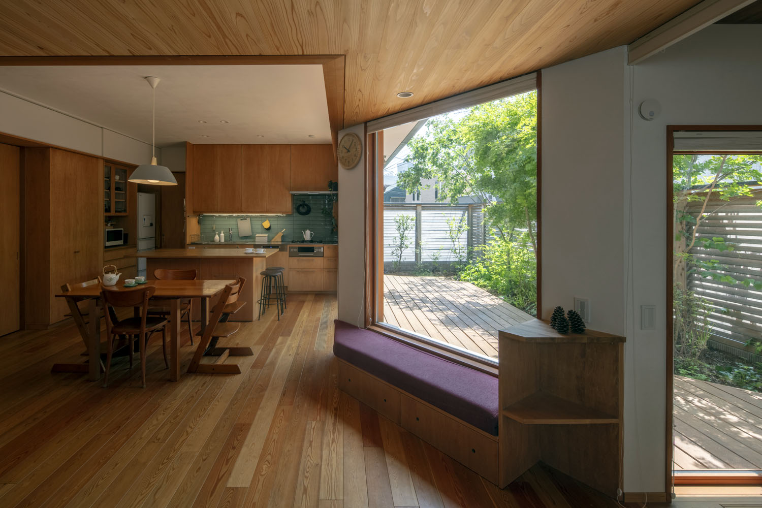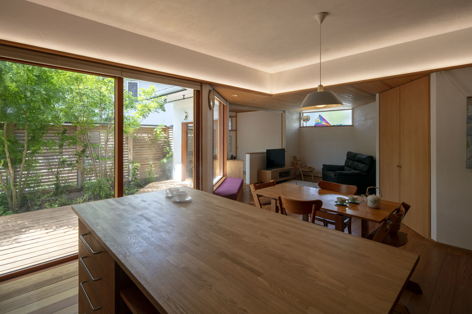 板塀と植栽で囲ってプライバシーを確保したデッキテラスに面してダイニングキッチン・リビング・タタミルームをL字型に配し、内外のつながる心地良い空間を実現しています。